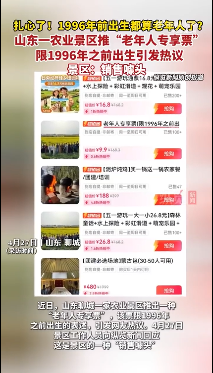据纵览新闻报道,近日,山东聊城一家农业景区推出一种“老年人专享票”,该票限1996年之前出生的表述,引发网友热议。4月27日,景区工作人员向回应,这是景区的一种“销售噱头”。